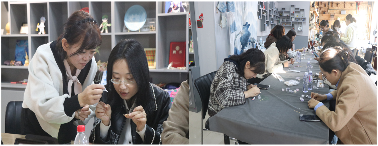 在非遗手工体验环节,党员教师走进“螺钿镶嵌”工坊,在专业老师指导下制作工艺纪念品。大家认真打磨、精心镶嵌,在实践过程中体会传统技艺的精细与传承的不易,进一步激发了立足岗位、精益求精的干事热情。